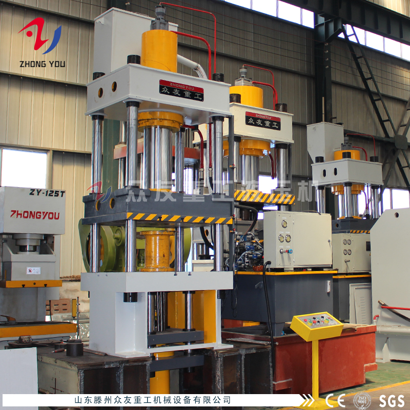200噸四柱油壓機是山東滕州眾友重工機械設備有限公司自主研發生產設計的,設備由主機及控制機構兩大部分組成,通過管路及電氣裝置聯系起來構成整體。主機部分包括機身、主缸、限程裝置等。控制機構包括液壓泵站(動力系統)、電器箱、移動操縱臺等組成。四柱式結構為壓力機很常見的結構形式之一,它的顯著特點是工作空間寬敞,便于四身觀察和接近模具,整機結構簡單,工藝性好